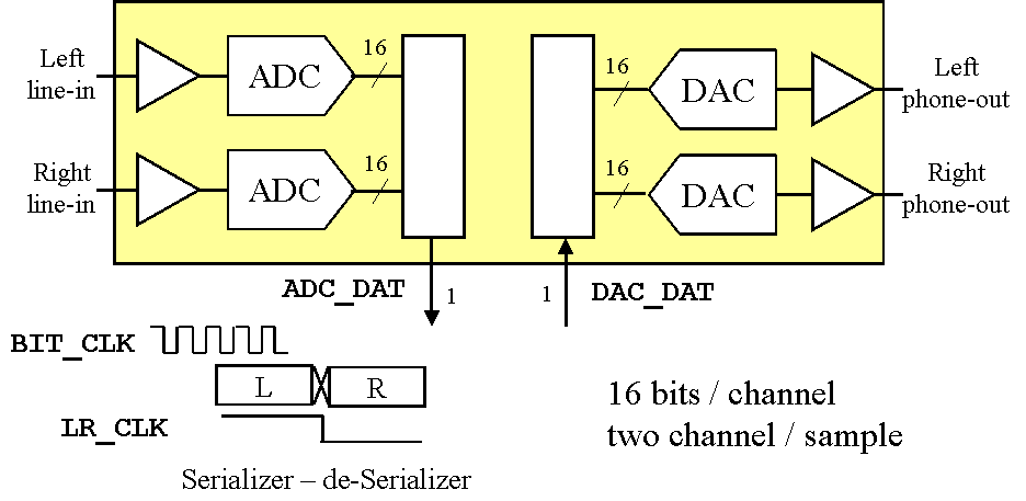The chip system clock is programmed for 384 fs = 18.434 MHz with a sampling frequency fs = 48 kHz. The bit clock must run at 32 fs, and the LR clock at fs, one channel is available at the rising edge and the other at the falling edge. The bit clock runs at 1/12 of the system clock.