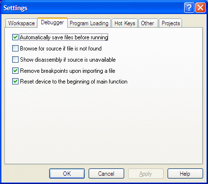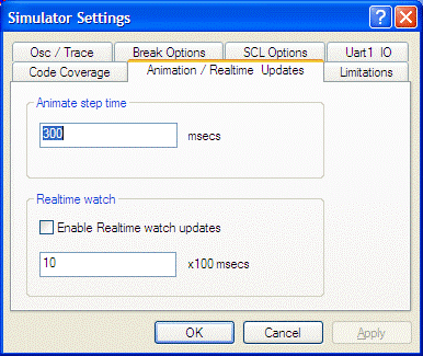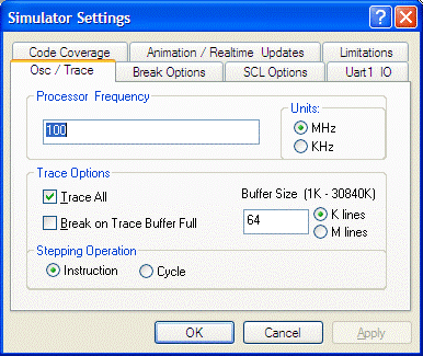 Select Debugger -- Select Tool -- MPLAB SIM from the top menu to activate the software simulator. Select Configure -- Settings ... from the top menu to bring up the Settings dialog box. Select the Debugger tab. Those options checked below are useful for the operations that follow: